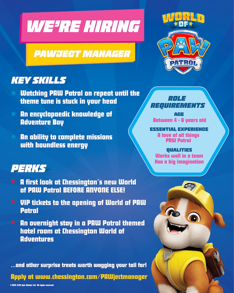 The winner will be the first to test rides, meet the PAW Patrol characters, receive tickets for their family to attend the opening event, stay in a PAW Patrol-themed hotel room at Chessington, and receive additional PAW Patrol merchandise.